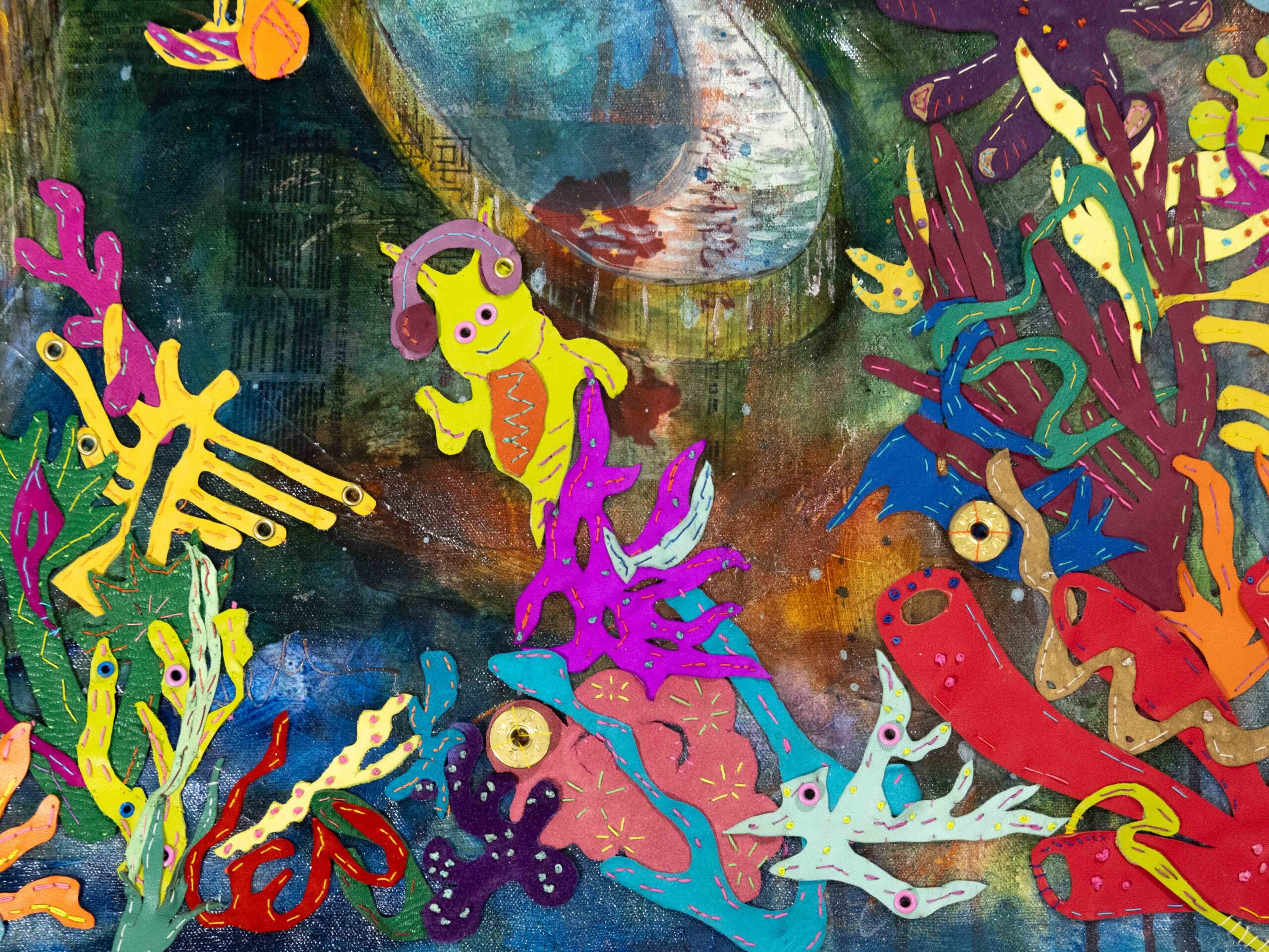A scuba diver since the age of 12, Turalba draws from lived experience underwater to reframe these conflicts. Her works translate power struggles into tactile forms, using leather and spent bullet shells to create vivid, oceanic compositions. In her visual language, weapons are reimagined as symbols of resilience, transformation, strength, and survival. Her pieces also invite viewers to consider the tension between fragility and fortitude.