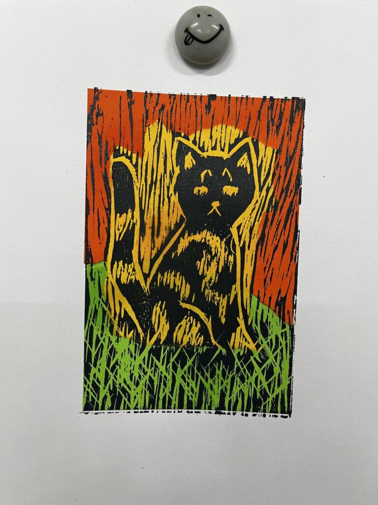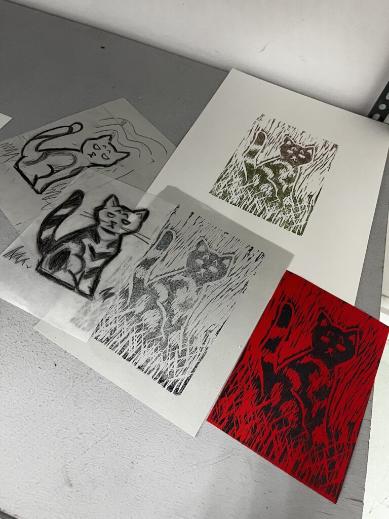 And then I knew. I chose my recently deceased cat, Noche. I drew him and imagined him in the garden, with grass made of straight cuts that flicked at the end, a contrast to the curves of his form. We sketched on pre-cut greaseproof paper, using a black 7B Mars Staedtler Lumograph pencil and really darkening the lines, then transferred the drawing onto a woodblock by rubbing the back of the paper to release the graphite.