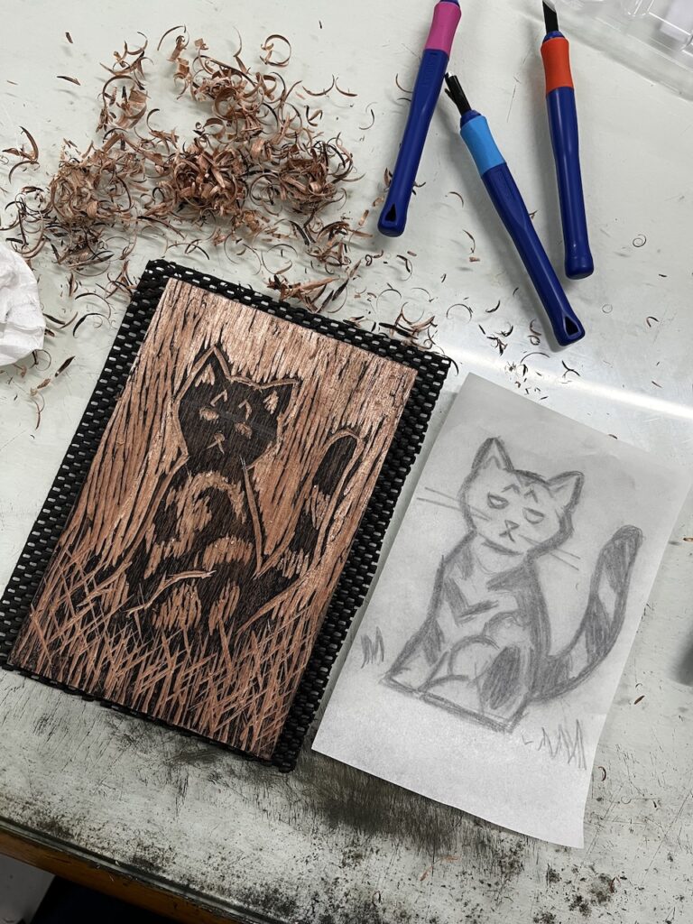 I heeded her advice. I flipped the woodblock, turned it to the side. My shoulders relaxed. I didn’t need to stand up. And I imagined how, with the way I was doing it earlier, I could have actually cut myself.