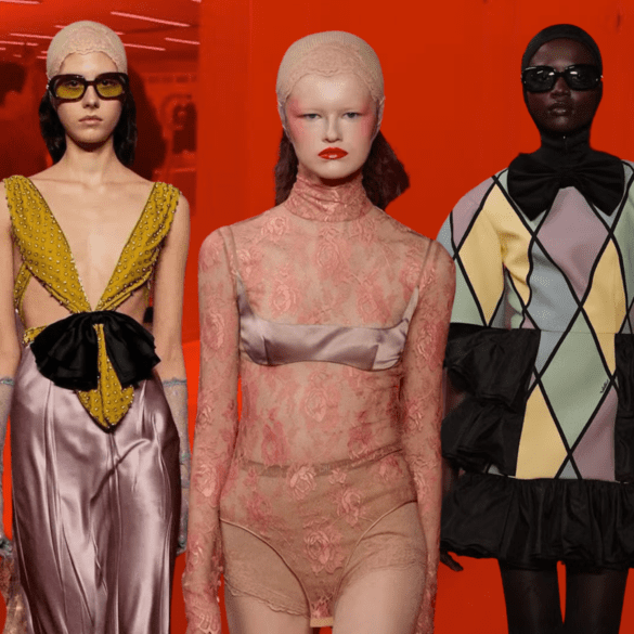 Set in a surreal red-lit public restroom, the collection mixed sheer lace bodysuits, grand evening gowns and exposed skin — questioning whether self-expression is ever truly private.