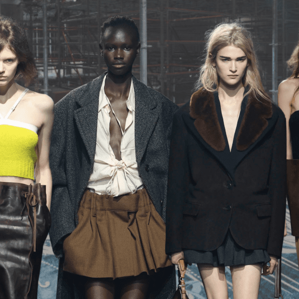Prada’s Fall 2025 collection challenges traditional femininity with loose silhouettes, raw seams, and shifting proportions. Miuccia Prada calls it a response to “a very black moment” in today’s world.