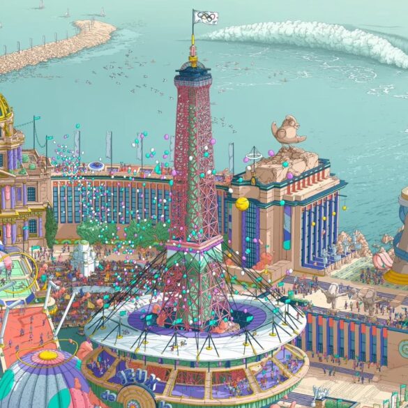 It’s the official Paris Olympics poster by French illustrator Ugo Gattoni, whose work is marked by surrealist, detailed worlds.