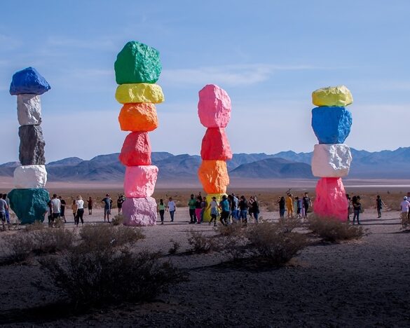 Swiss artist Ugo Rondinone’s vibrant hues form a kaleidoscope of neon colors that stand in contrast to the muted tones of the surrounding Nevada desert.