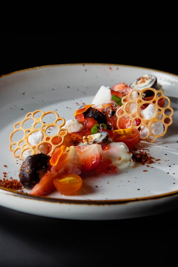 Invited to preview the special menu for the coming Day of Hearts, we were first served a whimsical amuse bouche of Chickpea and Caviar with Hokkaido scallops on a Chocolate-dusted Crisp balanced on an upside-down soup bowl. It was paired with a  Grandes Vinos 49 Millions Sparkling Rosé from Spain, with just a hint of sweetness, further enhancing the playfulness of the dish.