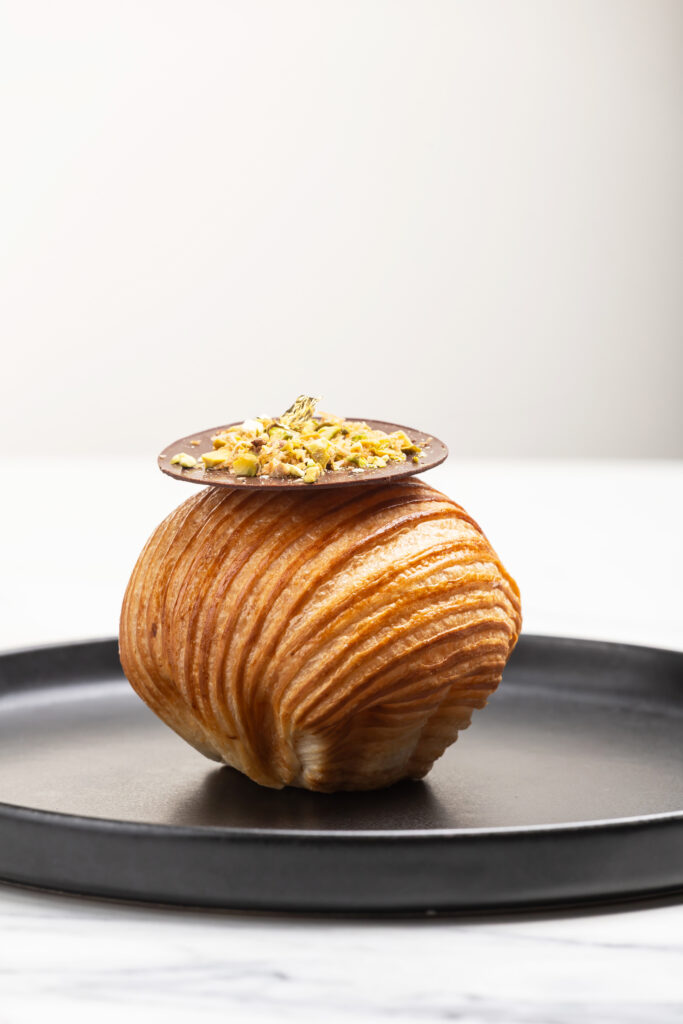 The Green Forest, his take on the Black Forest cake, replaces sponge with laminated dough and fills it with pistachio and cherry-brandy cream. It’s topped with a kunafa crisp, a nod to his years in the Middle East.