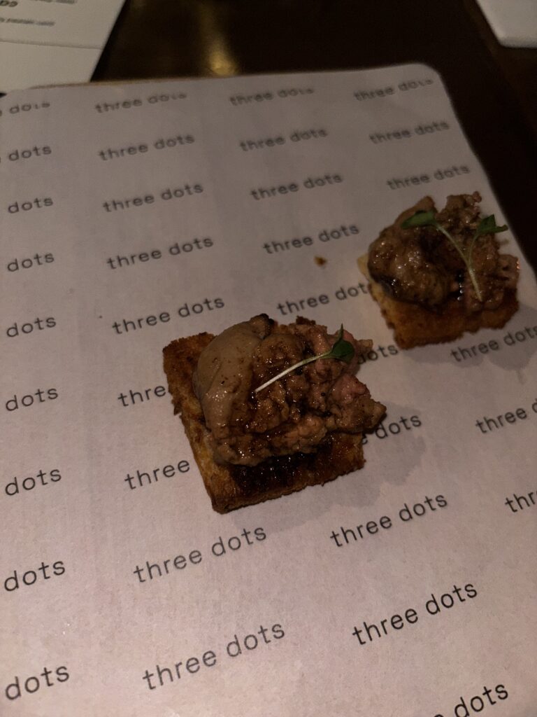 Next was the pandan chicken skewers, which is Three Dots’ take on inasal. The chicken was marinated in coconut milk, lightly smoky, and very tender. One of the stronger dishes for me.