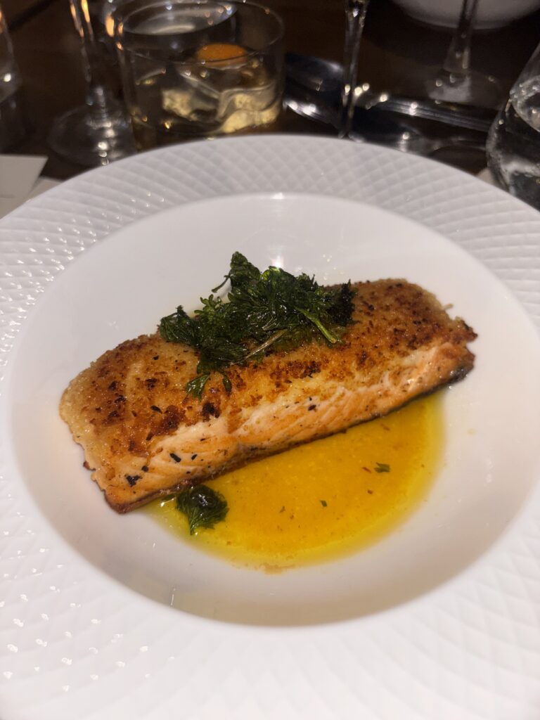 For the mains, the coconut-crusted salmon with pandan rice arrived first. At this point I was already full, but the salmon was hearty and the toasted coconut flakes added texture. Then the bistek tagalog rib-eye came in with fried onions and chimichurri, plus mushrooms and mashed potatoes on the side. Flavor-wise, this dish really belongs with rice—that’s just Filipino instinct: bistek is best with rice.