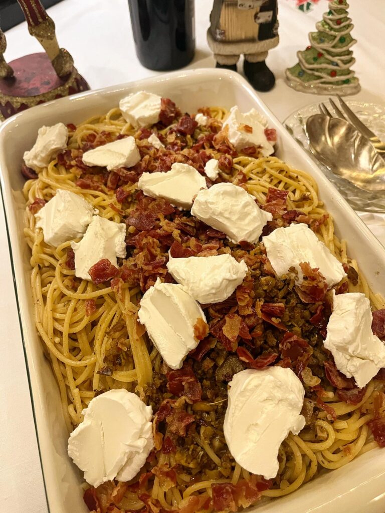 Classic flavors done differently—that is definitely chef Marco Rodriguez’s strength and the creative principle behind home-cooked dishes like his spaghetti with burnt butter, prosciutto, chestnuts, and goat cheese. It has all the familiar comforts of a rich pasta dish, the nostalgic flavors of Christmases past, and a uniqueness that allows it to stand on its own or pair with a juicy meat carving. It’s the kind of potluck offering that will surely have heads turning and mouths chewing.