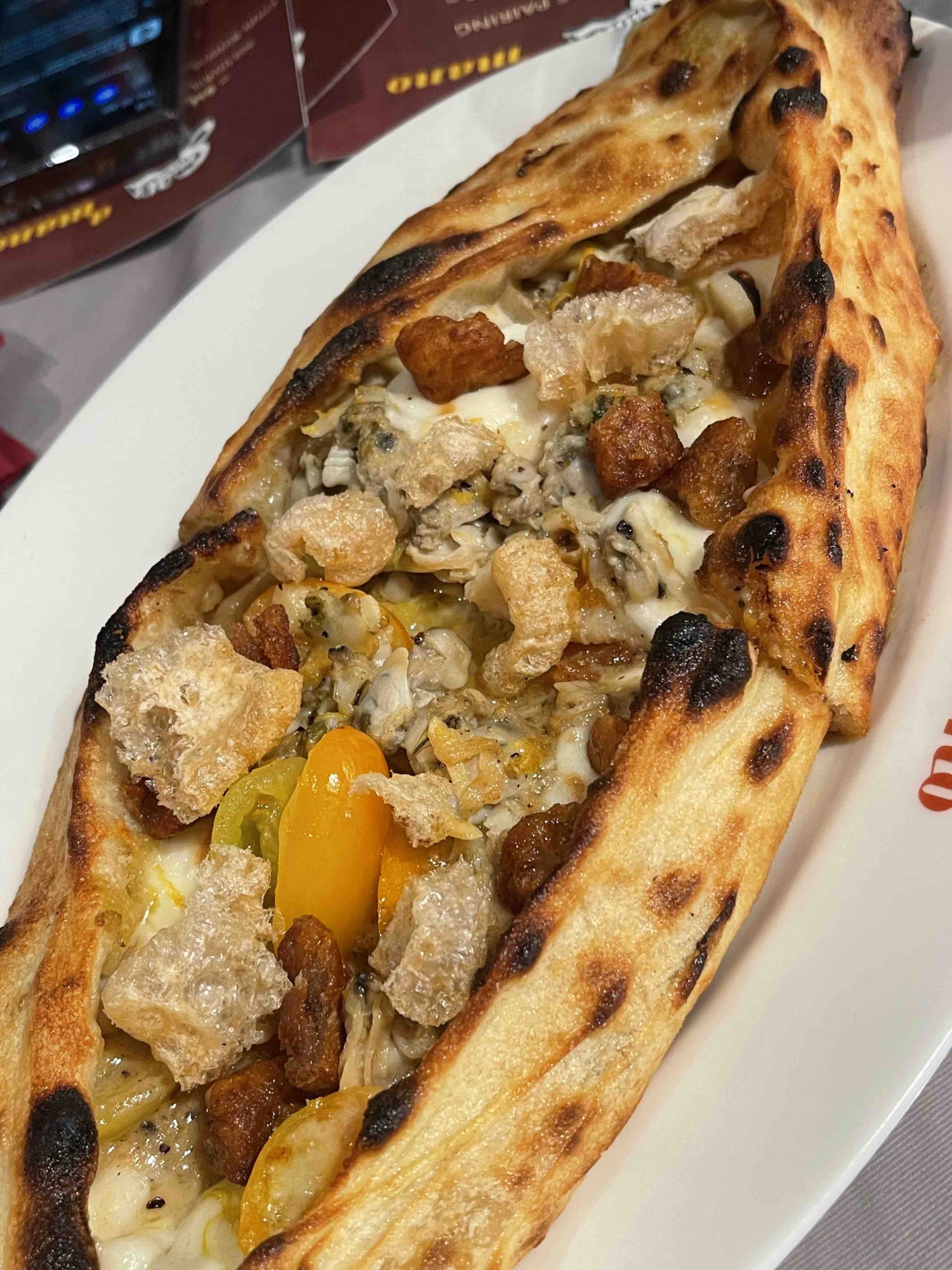 The third and last is not so different from pasta alle vongole but in pizza form—and it worked. Its toppings, consisting of garlic, clams, pork crisps (chicharon), and yellow tomatoes, contrast well with A Mano’s signature dough baked in their fire-engine red Valoriani oven.