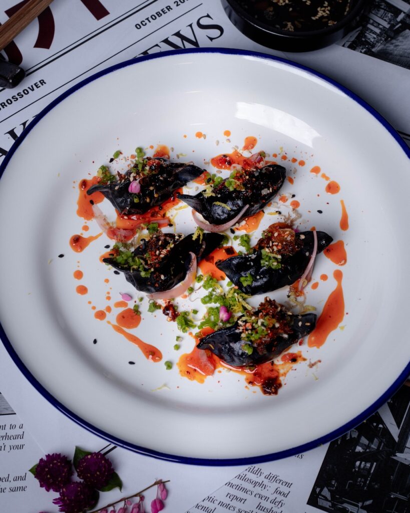 The Pork and Shrimp Dumplings are an umami bomb, packing a punch of flavor with the squid ink wrapper, chili crisp, and a yuzu aioli drizzle, and a dipping sauce of black vinegar and chili oil.