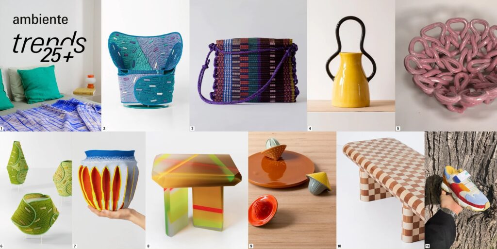 1. Beyond Bold Plaid Electric Blue by Emma Terweduwe; 2. Hana-Arashi armchair by Nendo for Paola Lenti; 3. Björk and Berries by Estelle Bourdet; 4. Pupa by Mathilde Bretillot; 5. Knitted Bowl by Milan Pekar; 6. Hana-Arashi floorlamp by Nendo; 7. Soft Objects by Gaspard Fleury-Dugy; 8. Flare coffee table #3 by Draga & Aurel x Todd Merrill Studio; 9. Cheese Platter and Juicers by Marta Bakowski; 10. Checkered Bench in solid cherry and maple wood by Studio Yellowdot; 11. Kids Sneakers by Neu-noi at House of Switzerland