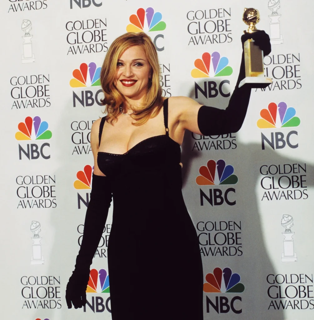 Madonna in a bespoke Dolce & Gabbana bustier gown at the 1997 Golden Globe Awards, where she won Best Actress for Evita.