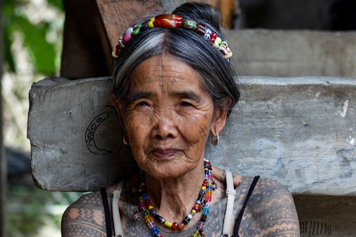 Also known as Maria Oggay, she is considered the last mambabatok of her generation. Her hand-tapping method of tattooing uses thorn and bamboo sticks and ink made from charcoal and water to imprint tribal design tattoos.