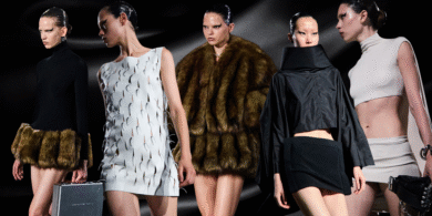 Wang also introduced a clever idea he called “convertibility.” One of the most talked-about pieces was a faux fur coat that first appeared on the runway as a dramatic outer layer. In the next look, the coat was removed to reveal a fitted black dress underneath but the same fluffy faux fur trim remained along the hem. This showed how one piece could be worn in multiple ways.