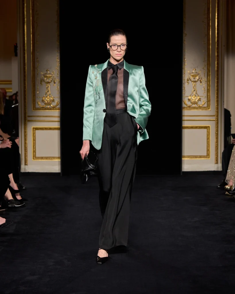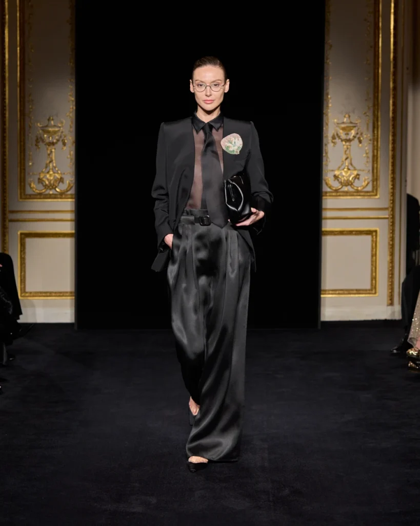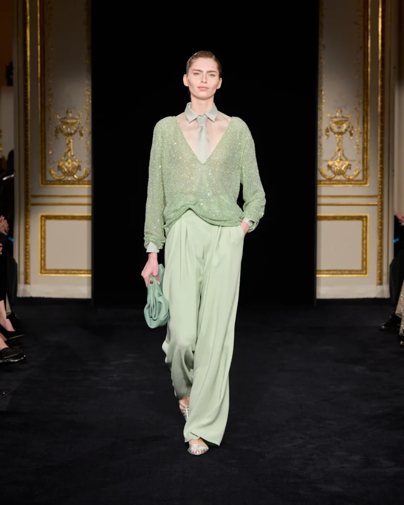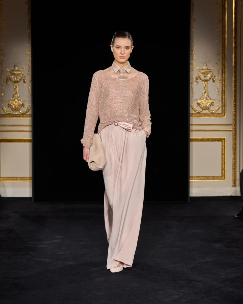 Many looks were built around trousers, including cocktail outfits designed to work from day into evening. Knitwear also played a role, with sparkly mesh sweaters and tunic-style tops worn in an easy, relaxed way, reflecting a growing interest in elevated knits across couture this season.