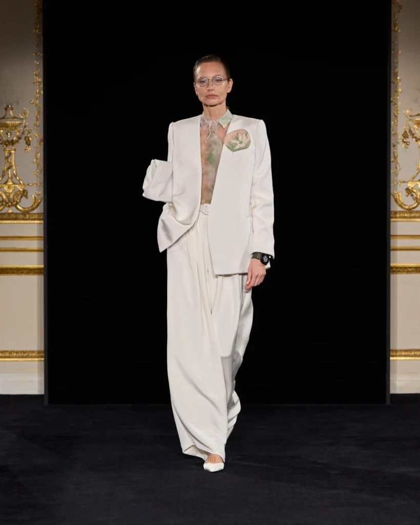 The show opened with tailoring, a key part of Armani’s identity. Jackets looked softer and more relaxed, others without lapels, and were paired with wide palazzo trousers in silk cady. Some had as many as ten pleats on each side, creating movement without feeling heavy. Organza shirts and sheer ties lightened the look, while fine glass beads traced the edges of jackets. Accessories were kept to a minimum, a clear choice that pointed to Silvana Armani’s preference for a cleaner, more modern approach.