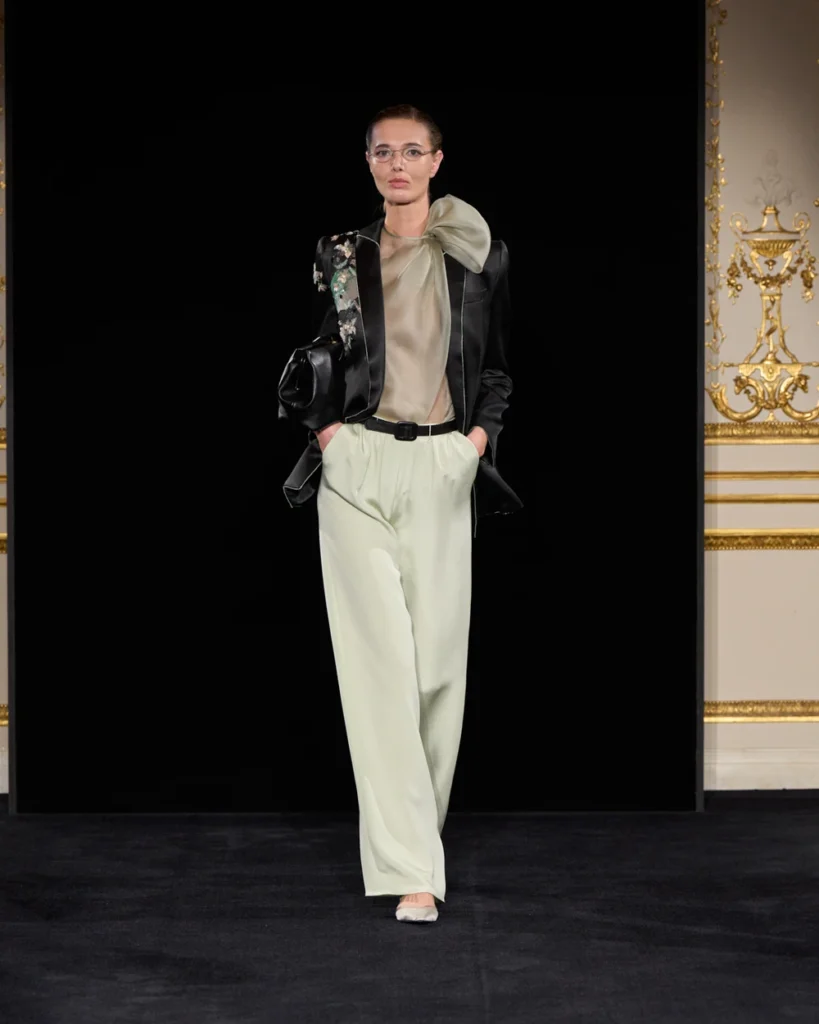 The collection was built around jade, a color and symbol chosen for its associations with balance and harmony. Celadon green, champagne, pale pink, white, and black formed a restrained palette that ran consistently through the show. Silvana reduced the lineup to 60 looks, down from the house’s usual hundred.