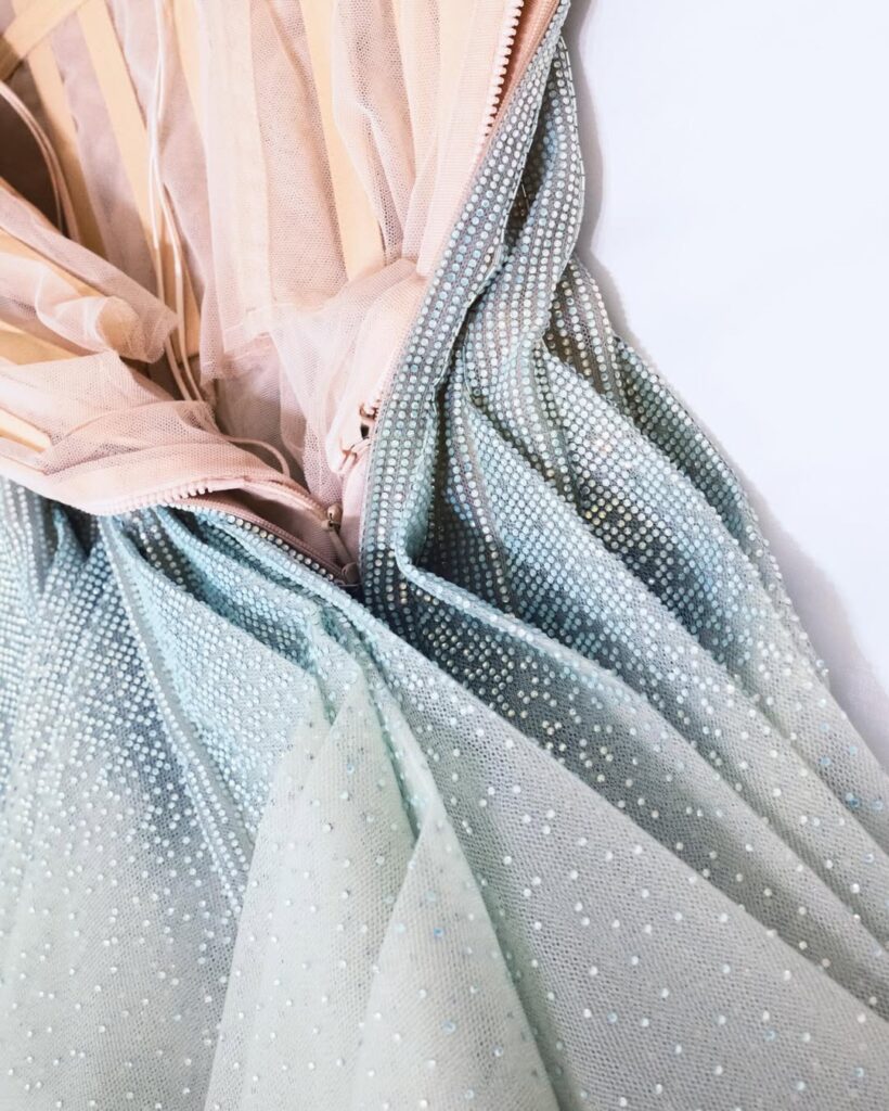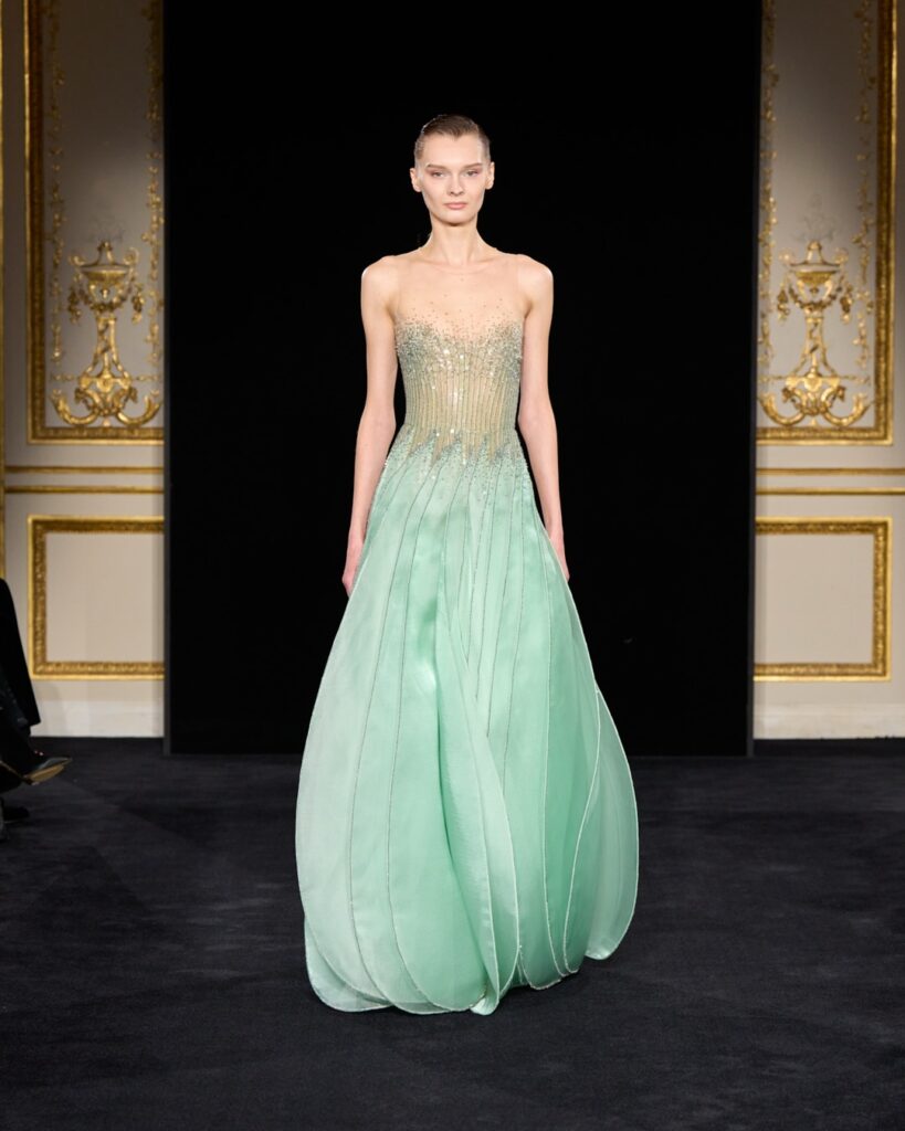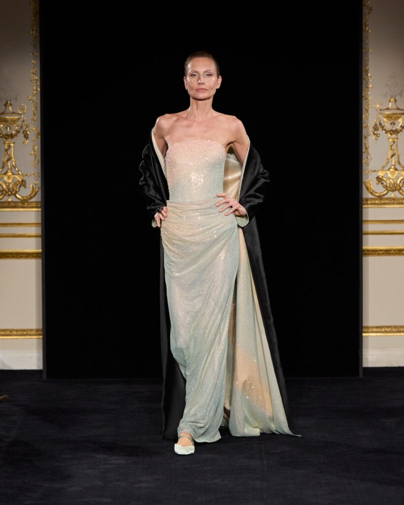 Crystal embroidery appeared often, but the shapes stayed simple and precise. Some gowns were layered with tiny crystals to add depth without adding weight. Others paired structured bodices with long skirts made from curved panels that moved smoothly as the models walked.. One standout look was a slim column dress fully covered in translucent crystals, worn under a black satin opera coat lined in soft green.
