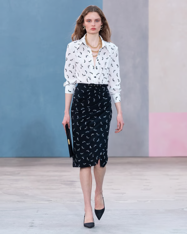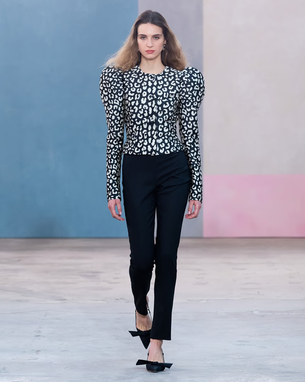 The silhouettes were strong yet they are still wearable. Exaggerated shoulders. Puff-sleeve blazers. Slim pencil skirts with asymmetric hems. Print also played a big role. Leopard jacquards added edge. Calla lilies appeared on dresses and tailored jackets. A sketch of a stiletto pump inspired by the Good Girl fragrance bottle decorated shirts, skirts, and dresses with a subtle ’80s mood.