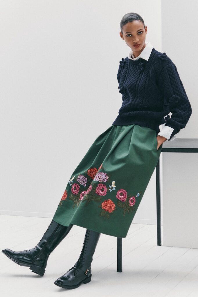 It is also evident in the navy cable knit sweater paired with a deep green floral- embroidered twill skirt and tall combat boots, as well as the cropped gabardine plaid jacket that he embellished with little pink rosettes and matched with a beige-belted twill pencil skirt.