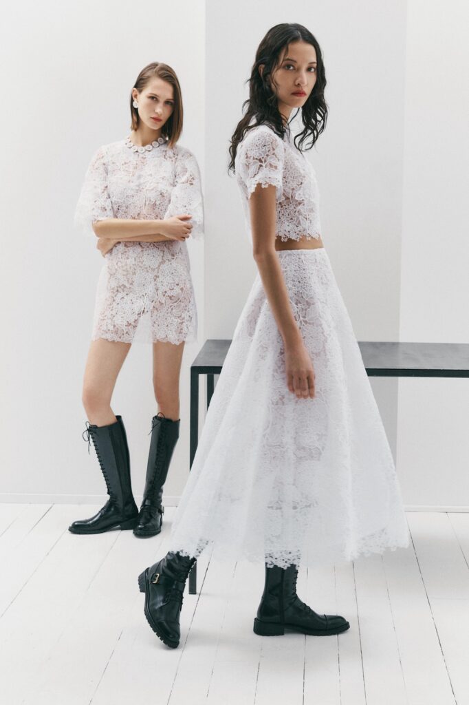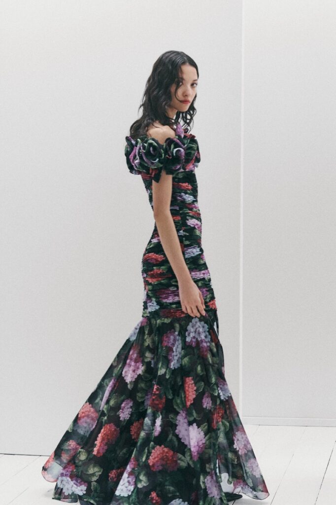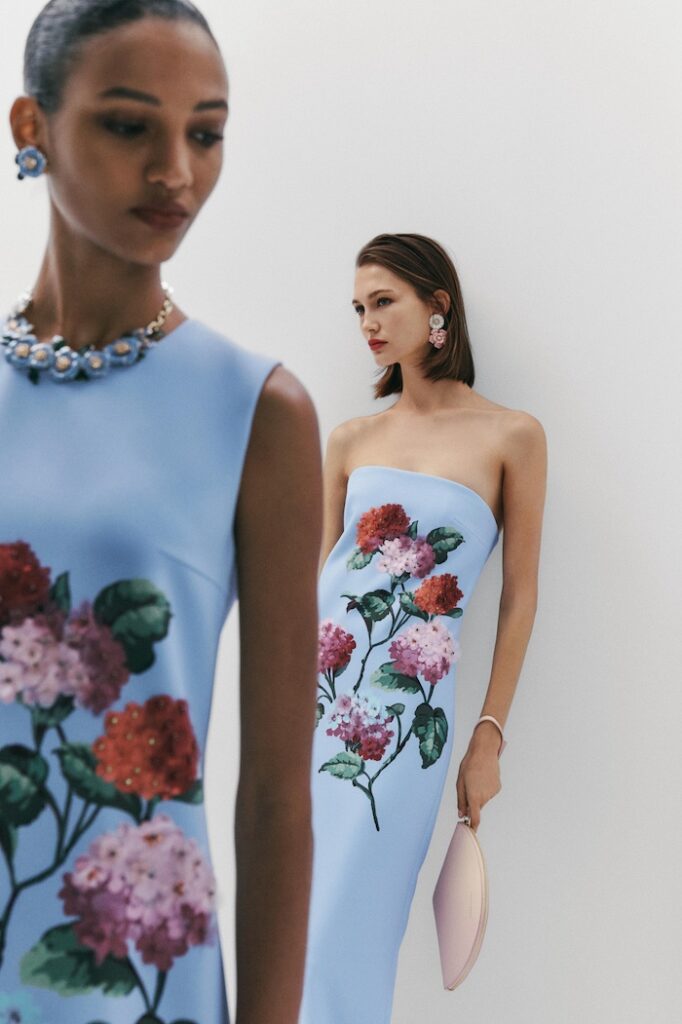 These women’s love of hydrangeas and peonies runs throughout the collection, embroidered or printed in dresses made of delicate chiffon, crepe and organza, as well as expressed in pretty lace layers, poplin, and silk.