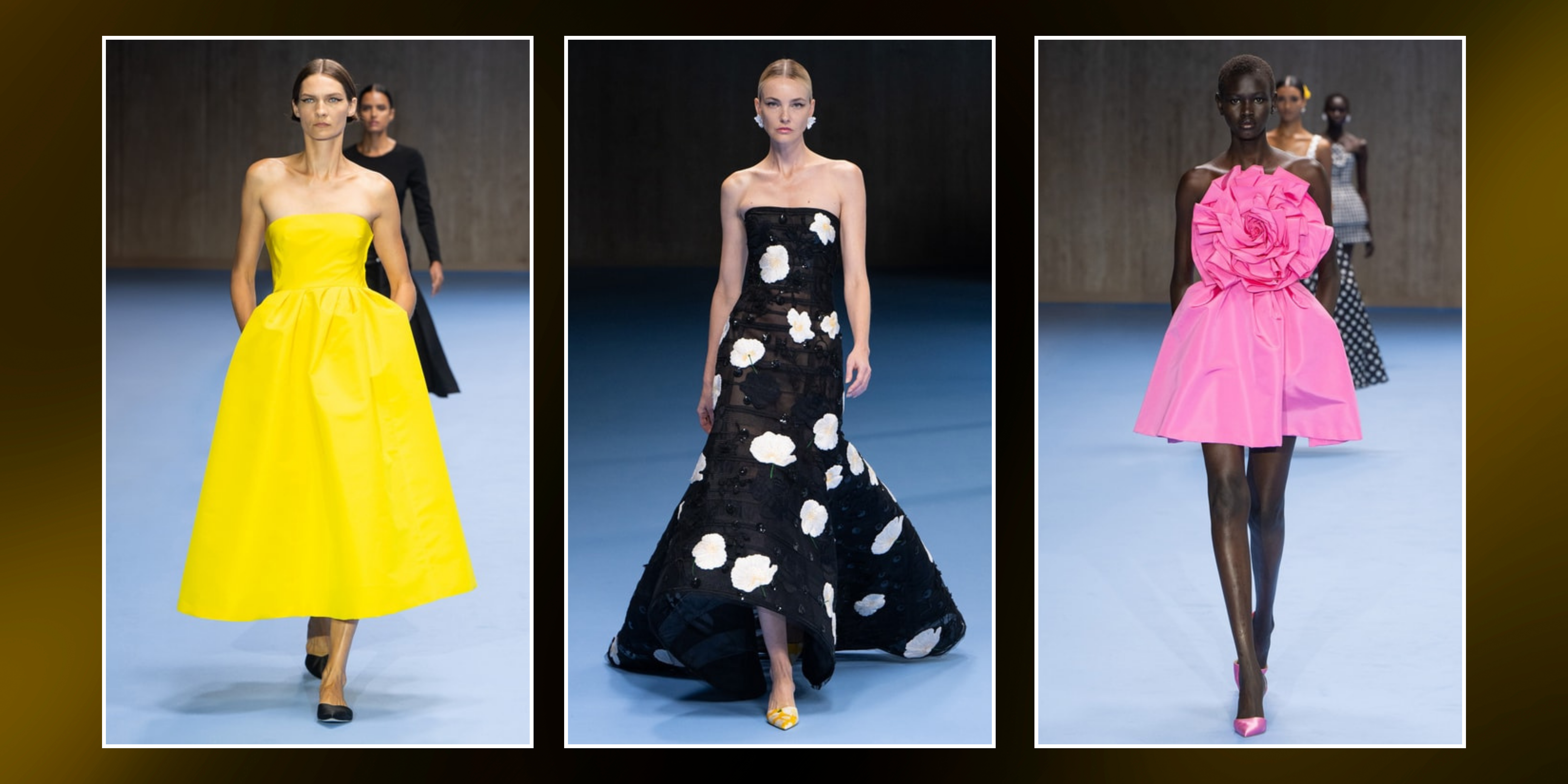 One standout piece—a polka-dotted dress with oversized floral prints—embodied the playful yet refined spirit of the collection. In the final looks, vivid yellow gowns that closed the show with a punch of color, paired with black for a dramatic contrast.