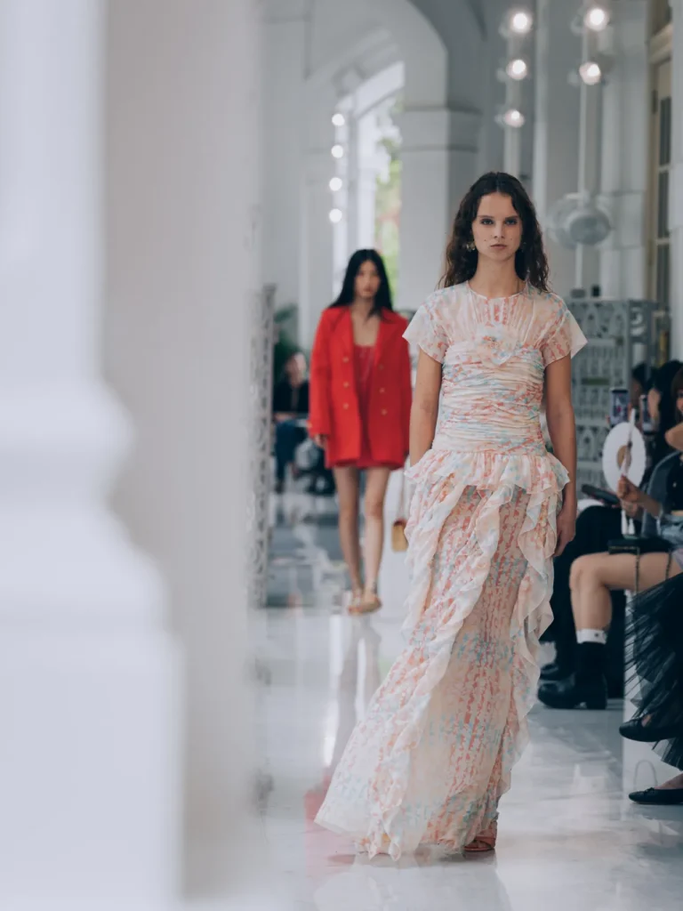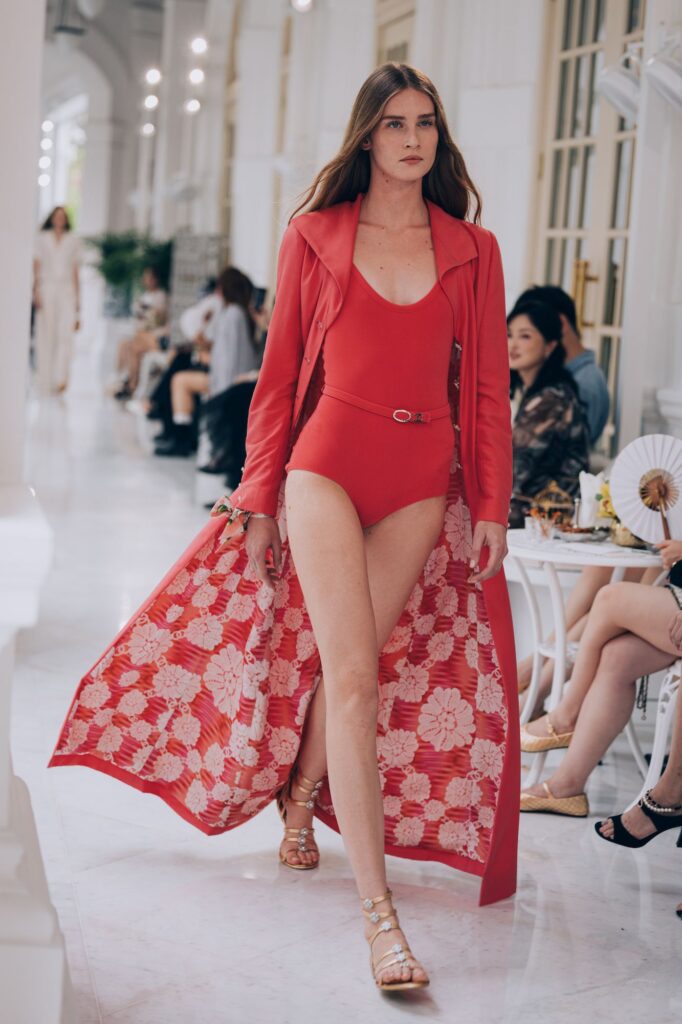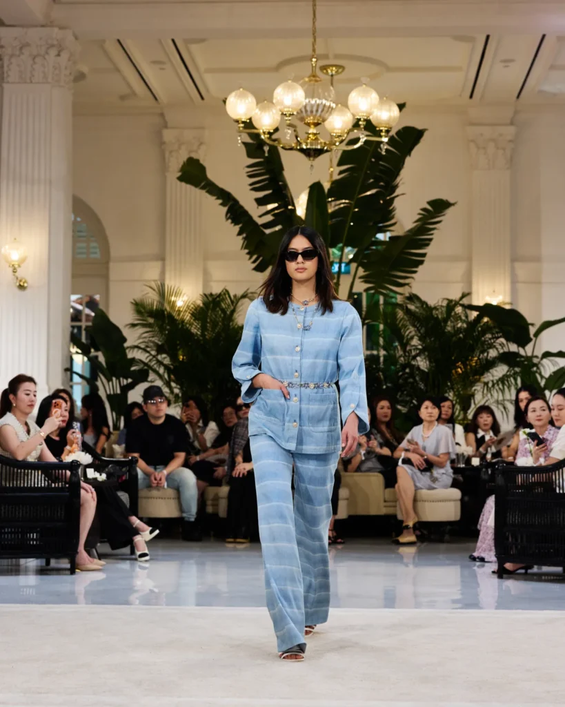 Around a thousand guests attended the Singapore show, including regional clients, editors, and celebrities. Models walked through the hotel’s courtyard and corridors instead of a traditional catwalk, reflecting the brand’s relaxed, travel-inspired theme.