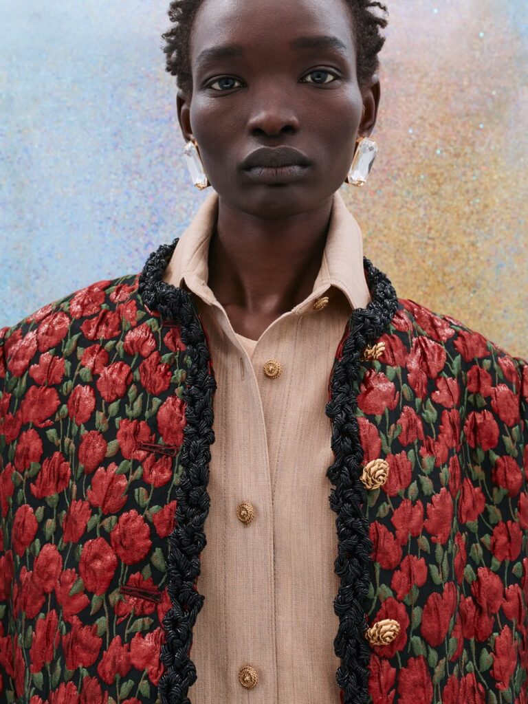 There was also a clear nod to the 1920s. Drop-waist silhouettes appeared in twinsets and pleated coats, creating a longer, more relaxed line through the body. Patchwork dresses with soft embroidery carried that same reference without feeling overly styled.