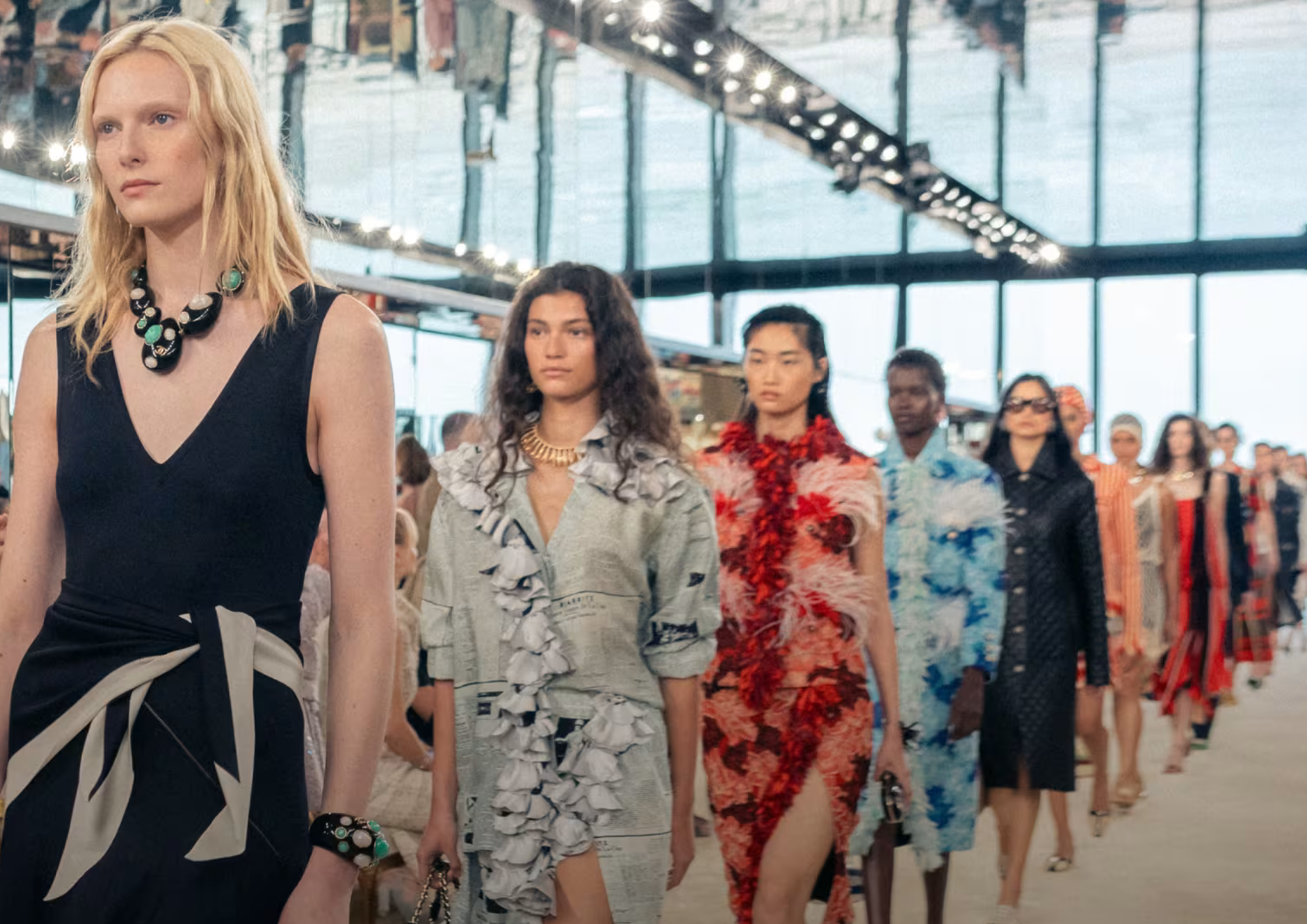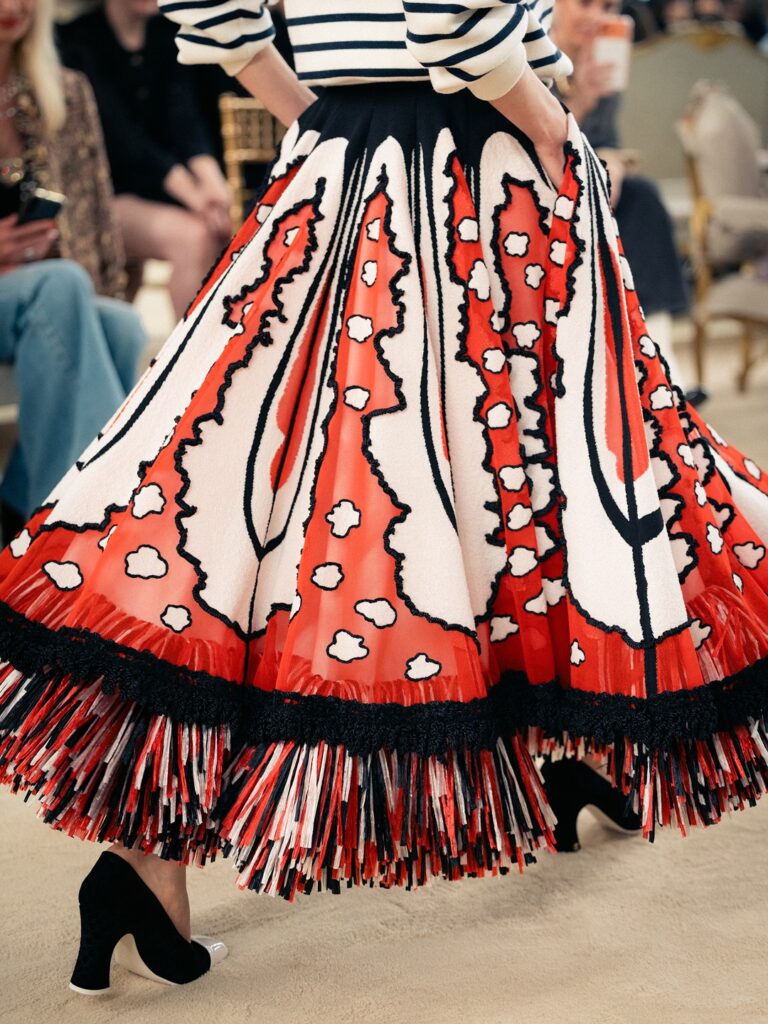 Near the end of the show, newspaper-print dresses appeared as another reference to Chanel’s world. Blazy tied the idea to Gabrielle Chanel’s love of reading newspapers, a detail that added a sharper note to an otherwise beach-heavy collection.