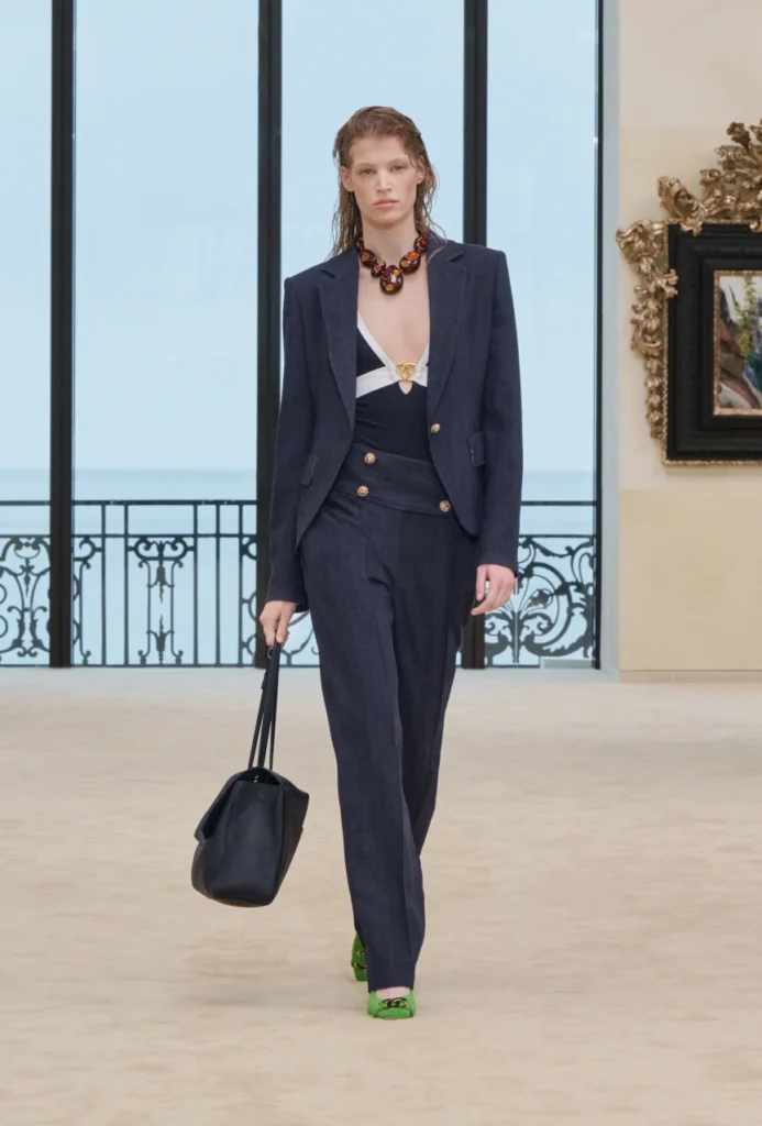 The Chanel suit also appeared in more relaxed forms, from khaki versions to striped-towel-inspired sets. Formal pieces felt lighter too, with suits, dresses, and eveningwear.