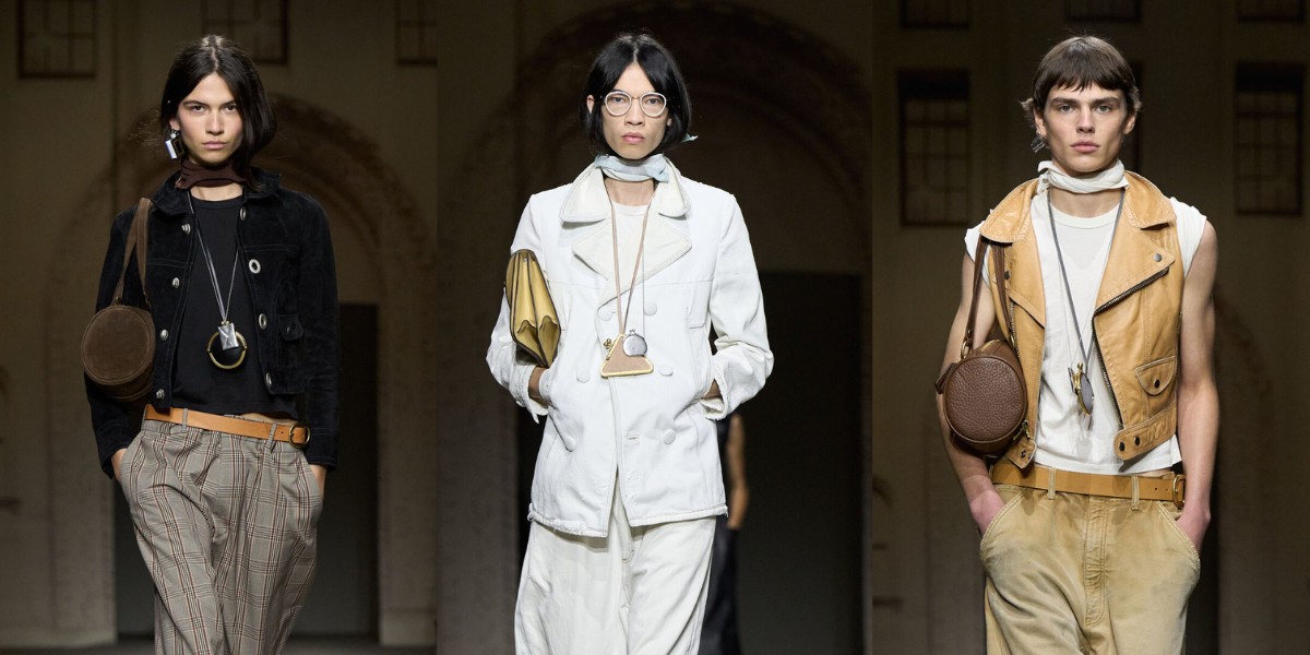 Outerwear includes motorcycle jackets, blousons, vests, peacoats, and cropped jackets in suede, nappa, and leather, embellished with minimal hardware, reflecting the house’s exploration of stripped-back and simplified aesthetic.