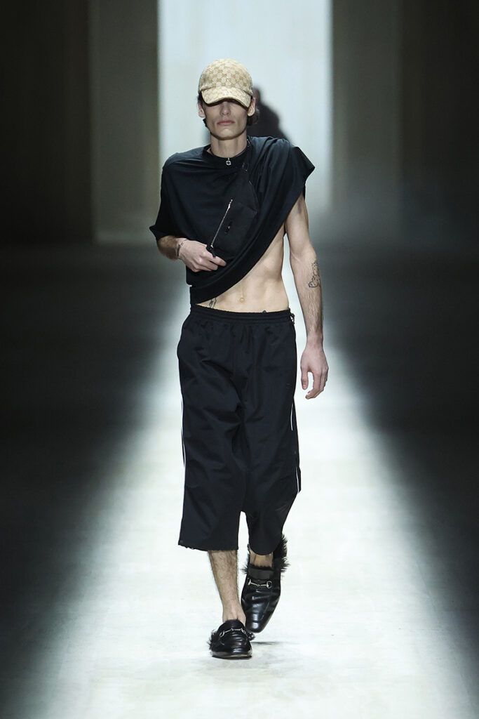 While the collection marked a new era for the house, several signatures retained their original form. The final look saw the legendary Kate Moss return to the Gucci runway after 30 years, wearing a black backless gown with an exposed diamond-studded GG thong. It was Demna’s playful nod to the house’s provocative history, reimagined for today.