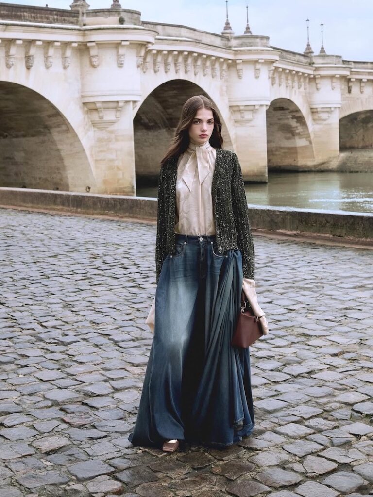 Meanwhile, the slouchy, ultra-wide-legged jeans aren’t really jeans—they’re made of silk denim and finished in multiple reverse pleats, turning the everyday garment into demi-couture fashion.