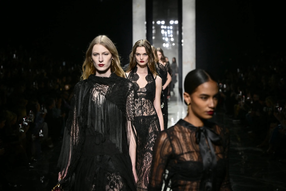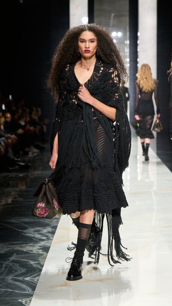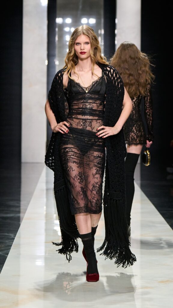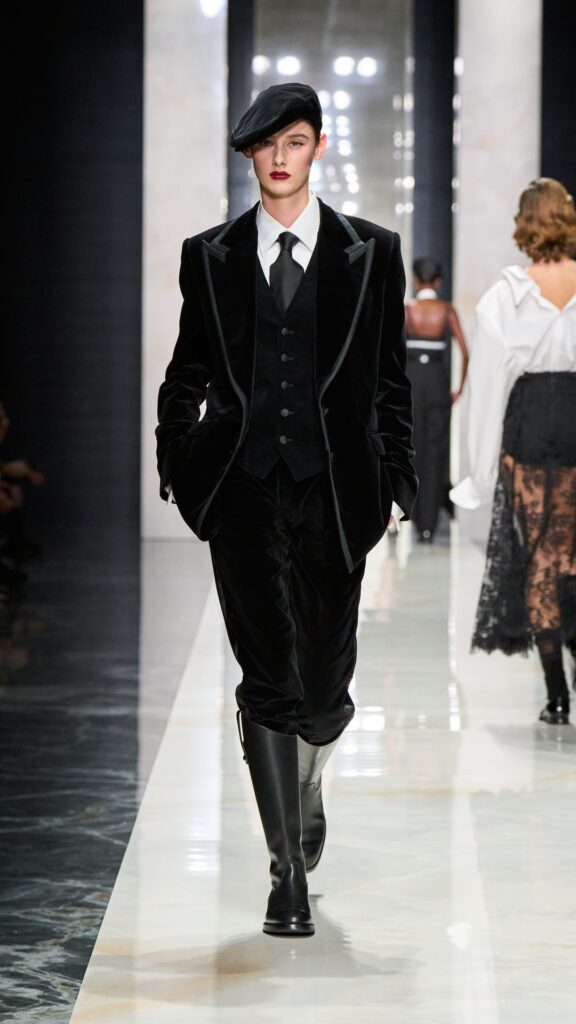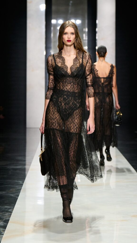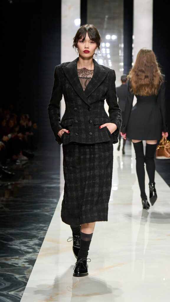 The collection, titled “Identity,” is not about nostalgia—“It is presence,” said house founders Domenico Dolce and Stefano Gabbana. It draws from a “language built on roots that are still alive. Sicily as emotion, black as strength, lace as intimacy, tailoring as authority.”