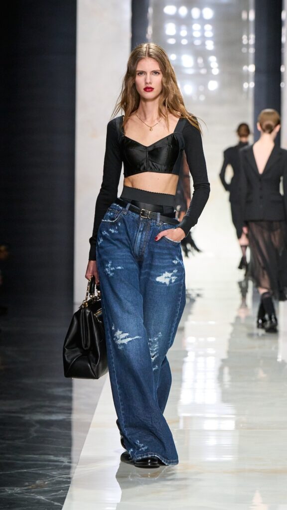 The collection embodied contemporary confidence in the other looks: baggy jeans paired with bra tops, collars that extended sharply off the shoulders; shirts that were worn inside out; high-waisted, figure-contouring cycling shorts; and sheer skirts. All these make for an edit that is simultaneously light and edgy, feminine yet commanding—reflecting the essence of Dolce & Gabbana across time.