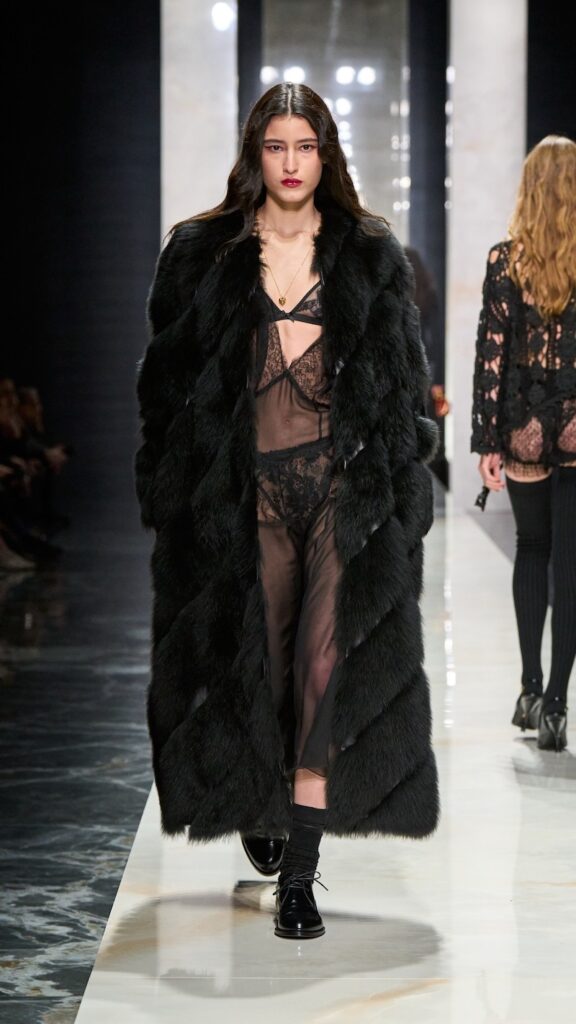 The runway abounded with lace. It showed up prominently in long-sleeved mini dresses, mid-calf skirts with soft hems, as well as translucent tops and bralettes layered over silk organza. Each piece revealed skin in ways that are sensual yet disciplined, precise, and controlled.