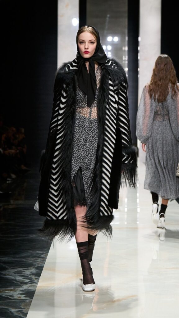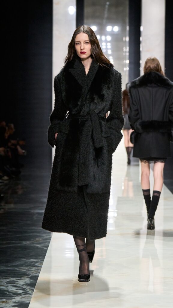 For the designers, the color carries deep Sicilian symbolism, long associated with mourning traditions, tragic heroines, and deep spirituality. It dominated not only double-breasted jackets and trench coats, but also pinstriped suits that came with a twist, such as stripes that wrap seamlessly from front to back.