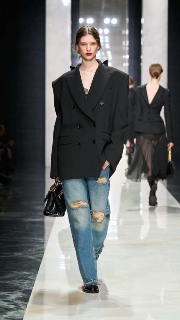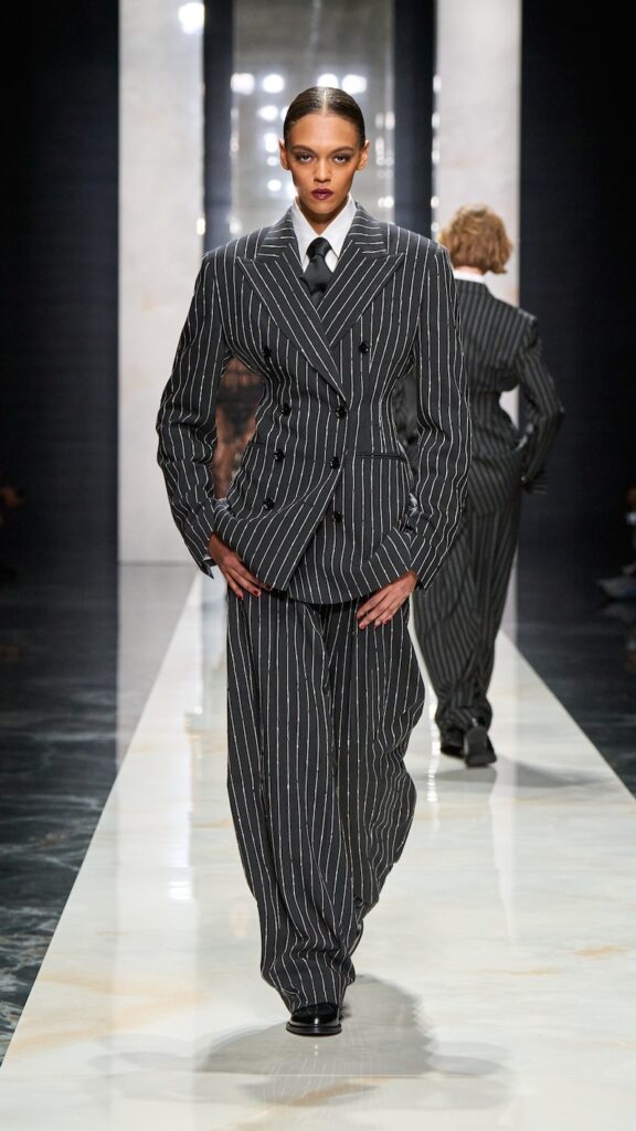 This story of “remaining true to yourself” was carried throughout the collection that showcases the house’s signature tailoring, which combines softness with defined structure. Dolce reimagined archival pieces with complexity and sculptural intention, referencing images of top models Marpessa Hennink and Isabella Rossellini in Sicilian men’s suiting during the house’s early years.