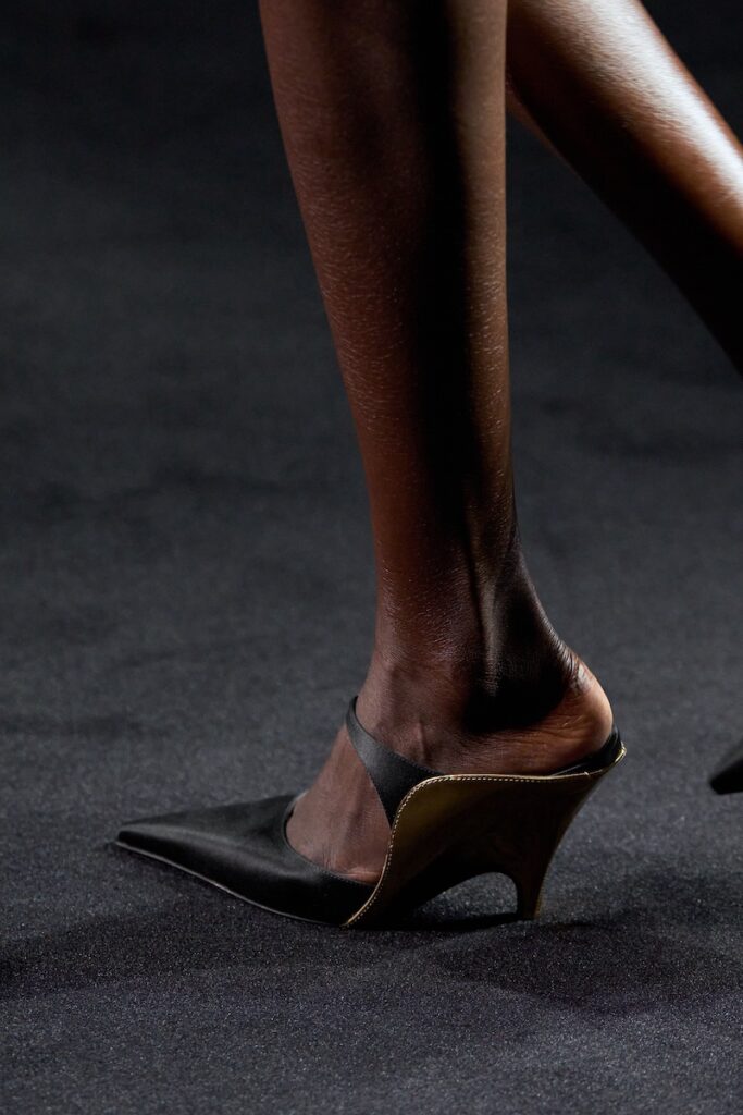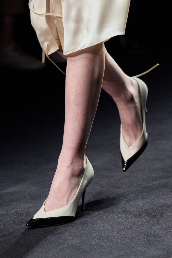 In footwear, a new pointed stiletto and sling-back with a deep vamp inspired by the flat designed by Salvatore Ferragamo in 1954 appear in color contrasts that echo nautical uniforms. Some were elevated with jewels. Elsewhere, the architecture of the “shell sole”—a technique pioneered by Ferragamo where the sole wraps around the foot—informs the curvilinear detail of sandals with heels hybridized with the silhouette of a wedge.