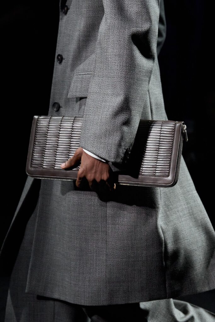 In accessories, a graphic new bag silhouette—slim and sleek and fastened with a Gancini plate—is introduced in three sizes, while the East-West proportion of the Hug is animated in new colorways. For menswear, a utilitarian cross-body pocket bag is used alongside a Hug pouch featuring woven calf leather.