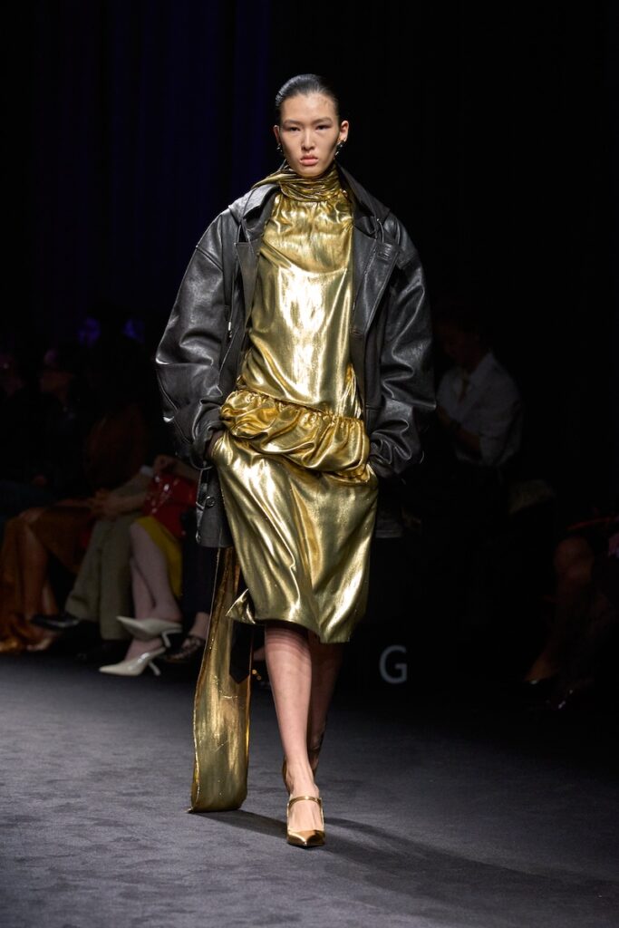 Alongside utilitarian attire, the liberated elegance of the period’s eveningwear emerges—slip dresses were reimagined in foiled velvet lamé and floral jacquard; drapery came in big volumes an connoted the evolution of ruffles; cocooning outerwear evoked couture silhouettes layered atop long-line gowns. The collection mirrors the speakeasy, where all these elements come together in motion.