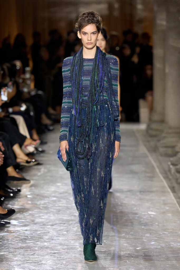 The final dress in the show—a soft, glittering gown in deep blue and radiant purple—was a spectacle of softness and transparencies. It was worn by one of Armani’s favorite models, Agnese Zogla, and featured an image of Armani’s face, drawing a standing ovation from the show’s 700 guests.