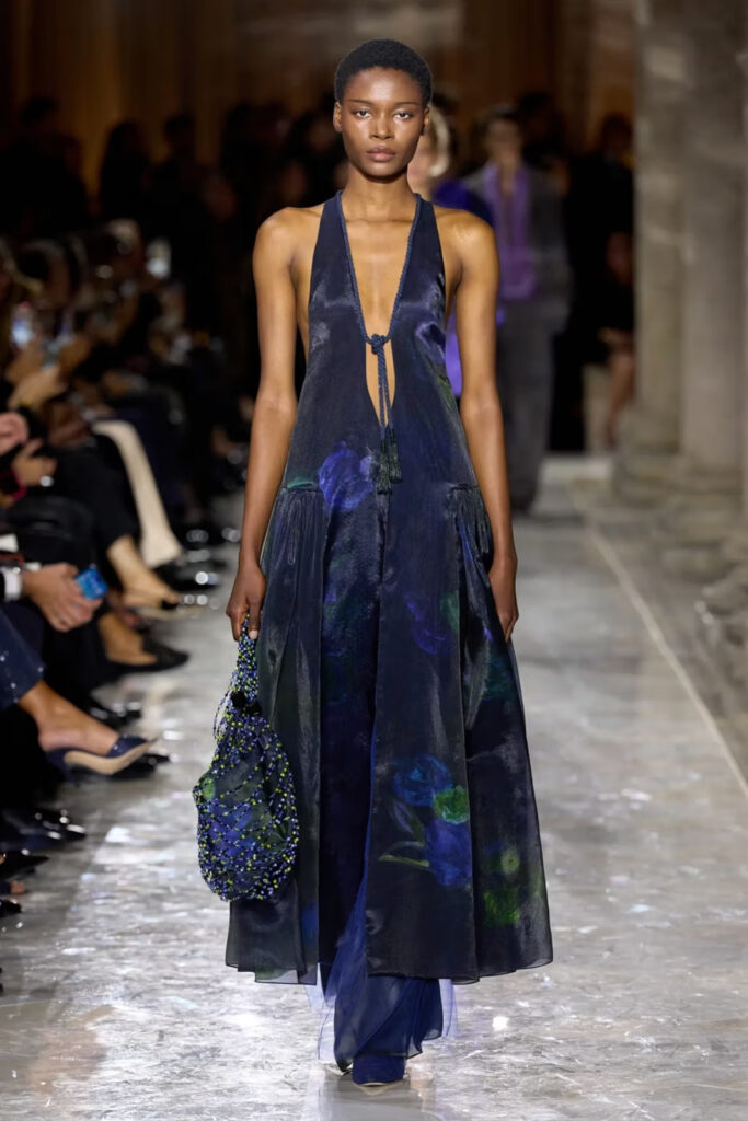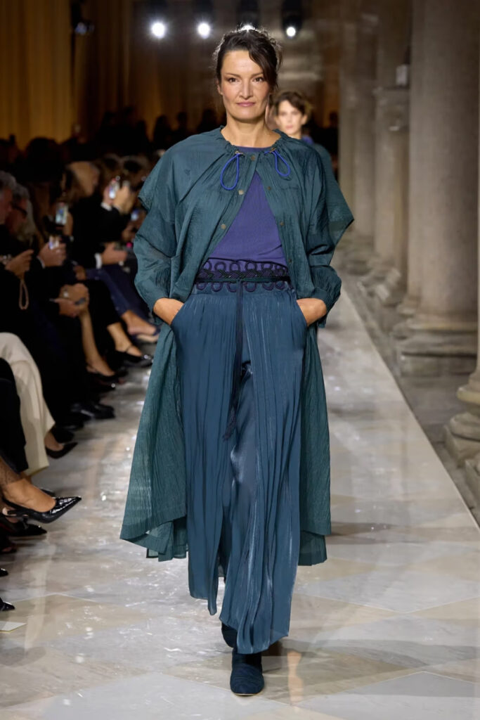 Like the designer’s five-decade career, the show followed a natural progression, beginning with creamy whites and soft neutrals before moving to mineral gray, midnight blue, and a flash of vibrant purple. Fabrics also traced the transition from day to night in crisp cottons, thin silks, and supple velvets. “Everything appears fluid, light, as if ready to yield to the island’s winds,” the maison noted.