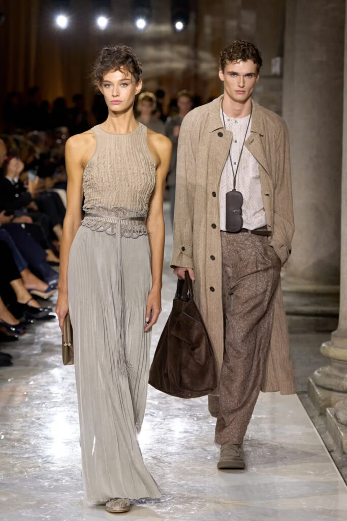 The show opened with the designer’s “power suit,” which became the very foundation of his style. They featured deconstructed, minimalist silhouettes, refined tailoring, and high-quality fabrics that altogether created a signature drapy effect. They came in sand and pearl gray, reaffirming the suit’s purpose of presenting elegance in its most essential and classic form.