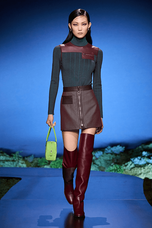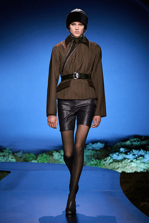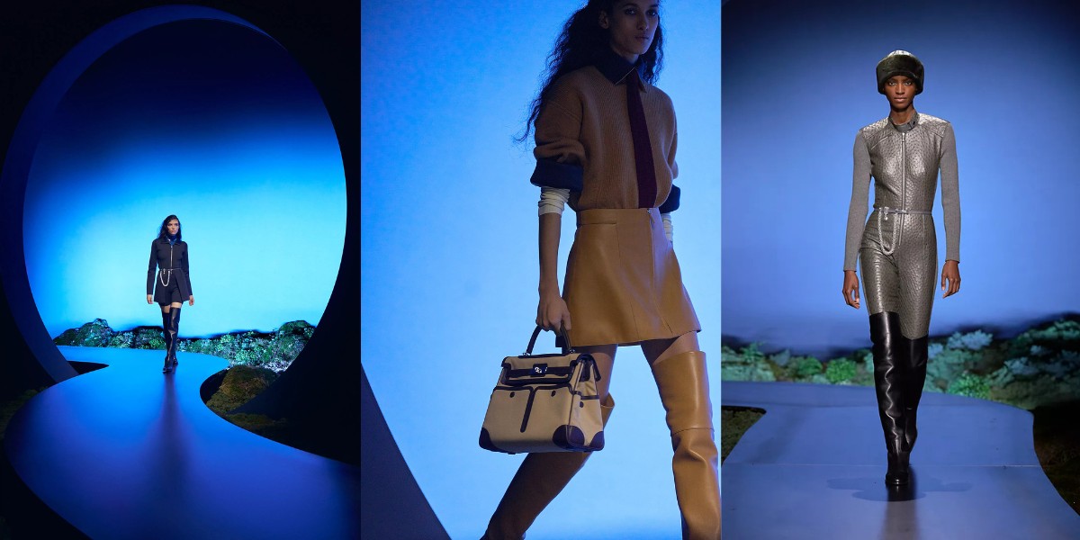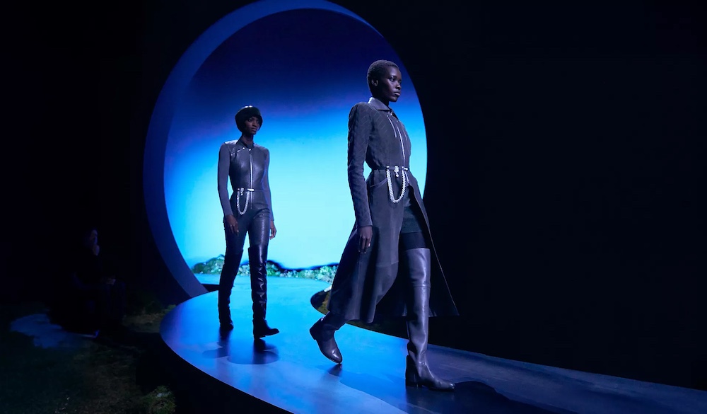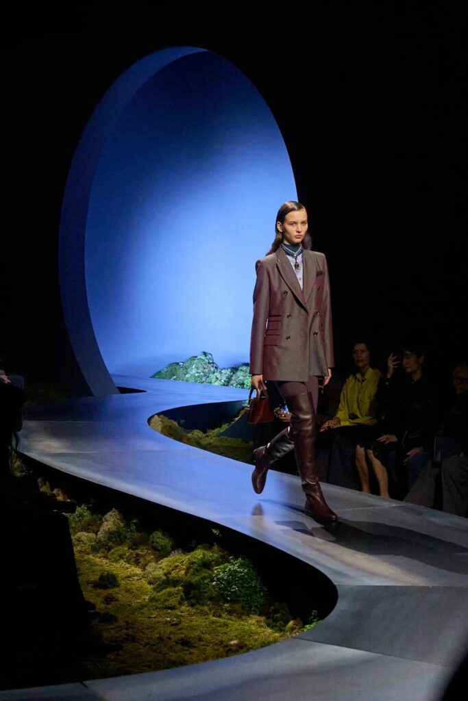 Guests who watched Hermés’ March 7 show entered the house’s own enchanted forest built inside the historic Garde Républicaine (the barracks of the French Republican Guard). Here, Vanhee designed a winding runway that cut through a landscape of soft moss and dense greenery. She bathed it in blue twilight, which made up for the show’s dusky and sensual mood.