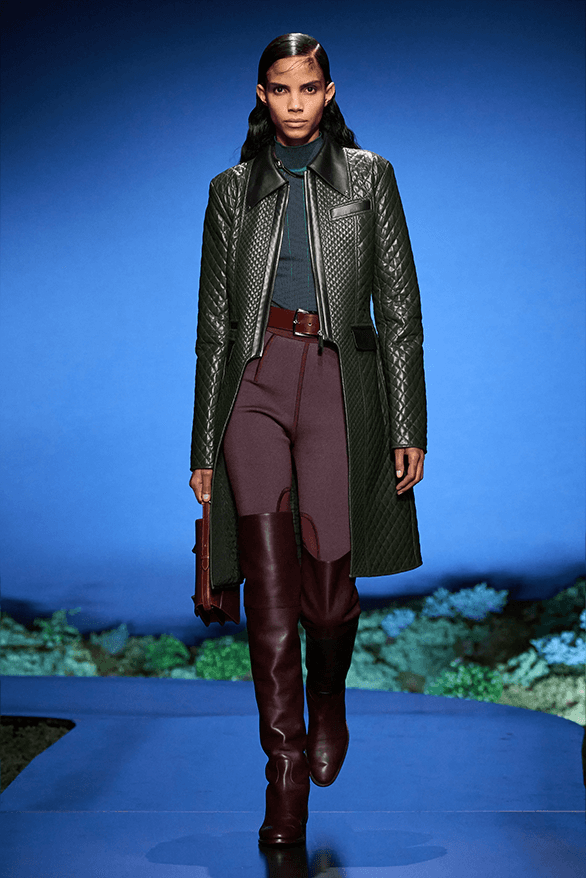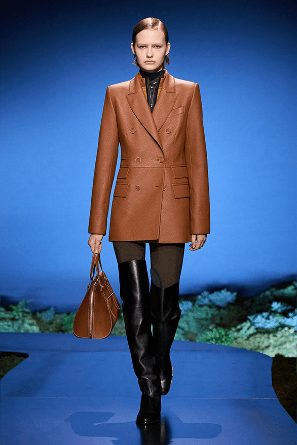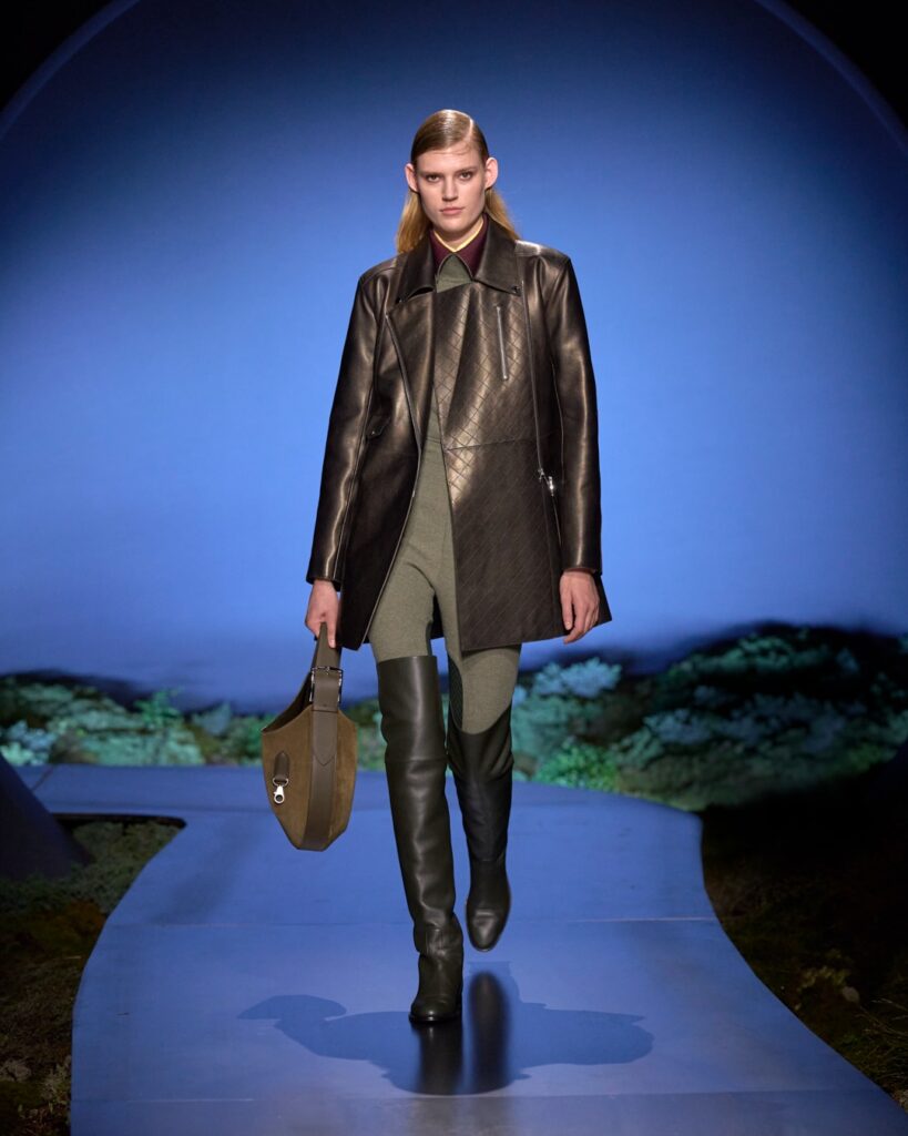 Hermès’ equestrian heritage remained at the heart of the collection. It was revealed in sharply tailored coats cinched with chain belts and thigh-high riding boots designed for the saddle. Vanhée matched them with Cossack hats and thigh-high boots with flat heels that were made for walking.