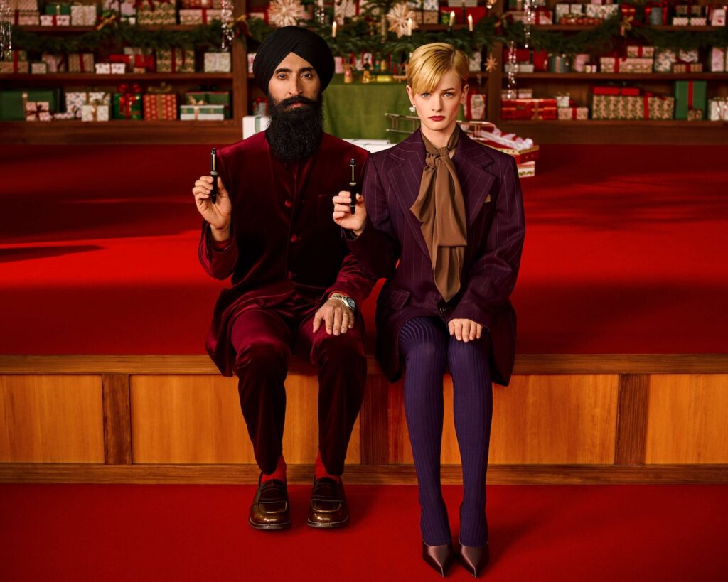 First imagined in Wes Anderson’s short film Let’s Write, the setting returns—quirky, symmetrical, bathed in jewel-toned glow—now captured through the lens of photographer Charlie Gray. Rupert Friend, Joey King, Daniel Brühl, Esther McGregor, and Waris Ahluwalia reunite with Montblanc global ambassadors Xin Zhilei and Jing Boran, slipping into scenes that feel whimsical and nostalgic.