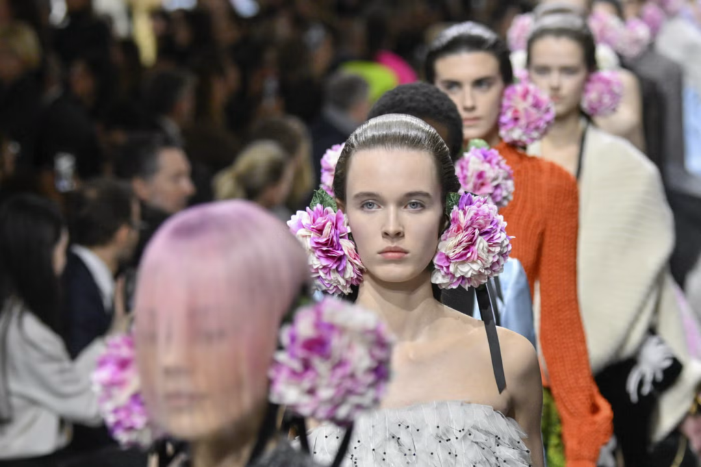Before the models walked, Dior showed a short film. It opened with flowers and ceramic pieces, then moved inside the ateliers. The camera focused on hands, pins, scissors, measuring tape, and fabric being shaped.