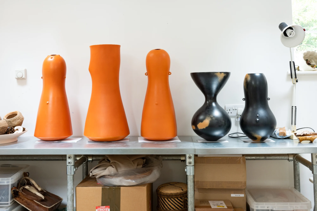 Another major influence on the collection came from the ceramic work of Magdalene Odundo, whose handcrafted vessels are known for their rounded forms and human-like proportions. Anderson has been a fan of her work, and for this collection, that inspired the shapes we all saw on the runway.