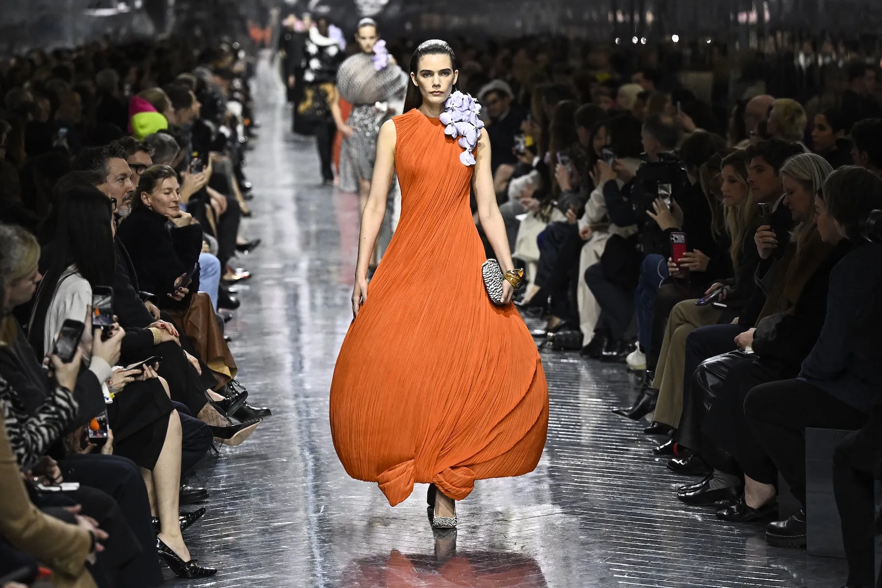 The first looks were sculptural dresses made from pleated fabric in black, white, and burnt orange. A version of this shape had already appeared in Anderson’s earlier Dior work, but couture allowed him to push it further.
